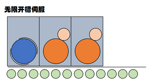 無限開槽應用在瓦楞紙水墨印刷機的后段,開槽部分。主要實現的是成產紙板長度大于開槽周長的超長箱型,運動控制采取凸輪動作來實現該效果。